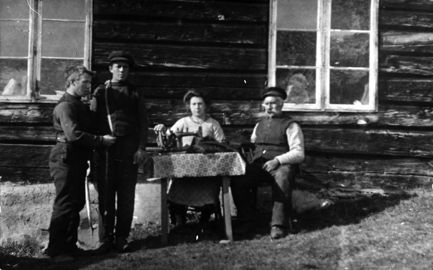 Hesjing på Hoset. F.v. Hans Hoset, to ukjente kvinner, Knut Hoset (sitjande), John Hoset (Øien).