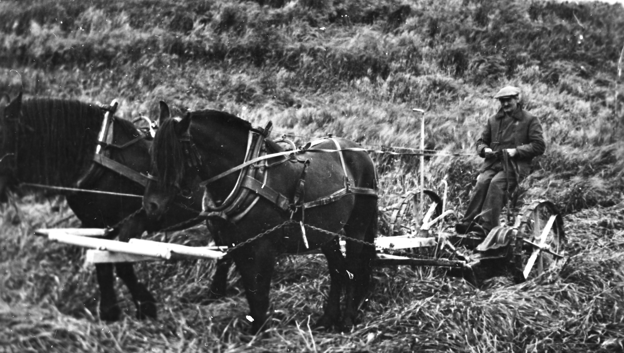 REF-0098 Furuly, Tverdal, Rennebu, ca 1937-38 - Pløying ned to hestar.