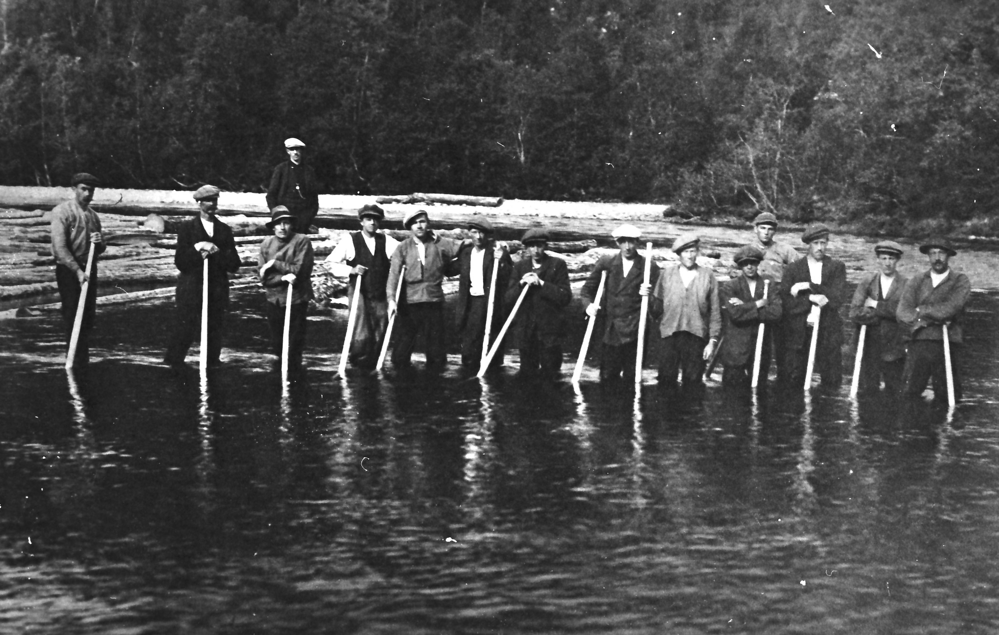 REF-0124 Røsøra, Grindal. ca 1918-21. Tømmerfløting. Foran f.v: Ola Hokoldegg, John Nergård, Olav Myrmæl, Martin Resellmo, Einar Hoseth. Bak f.v: Nils Reitøyen, Rasmus Myrhaug, Lars Løseth, Iver Myrhaug, Hans Øyen, Person(svensk), Olav Nergård, Martin Ryhagen, Einar Damli, Hans Lien.