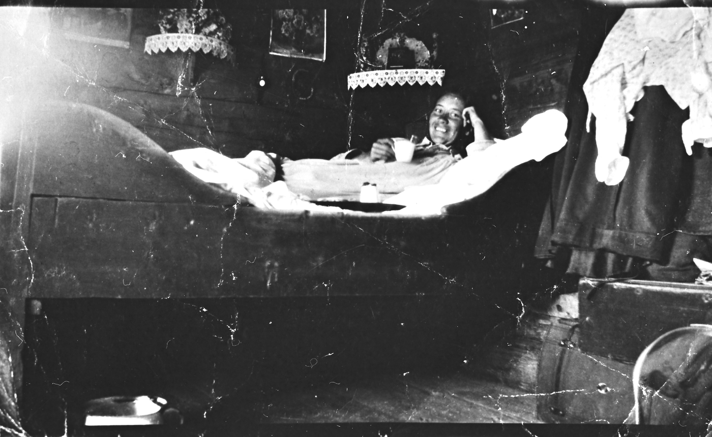 Interiør Hoset-sætra. ' Morgenkaffe paa sæteren.' Frk Silseth i senga.