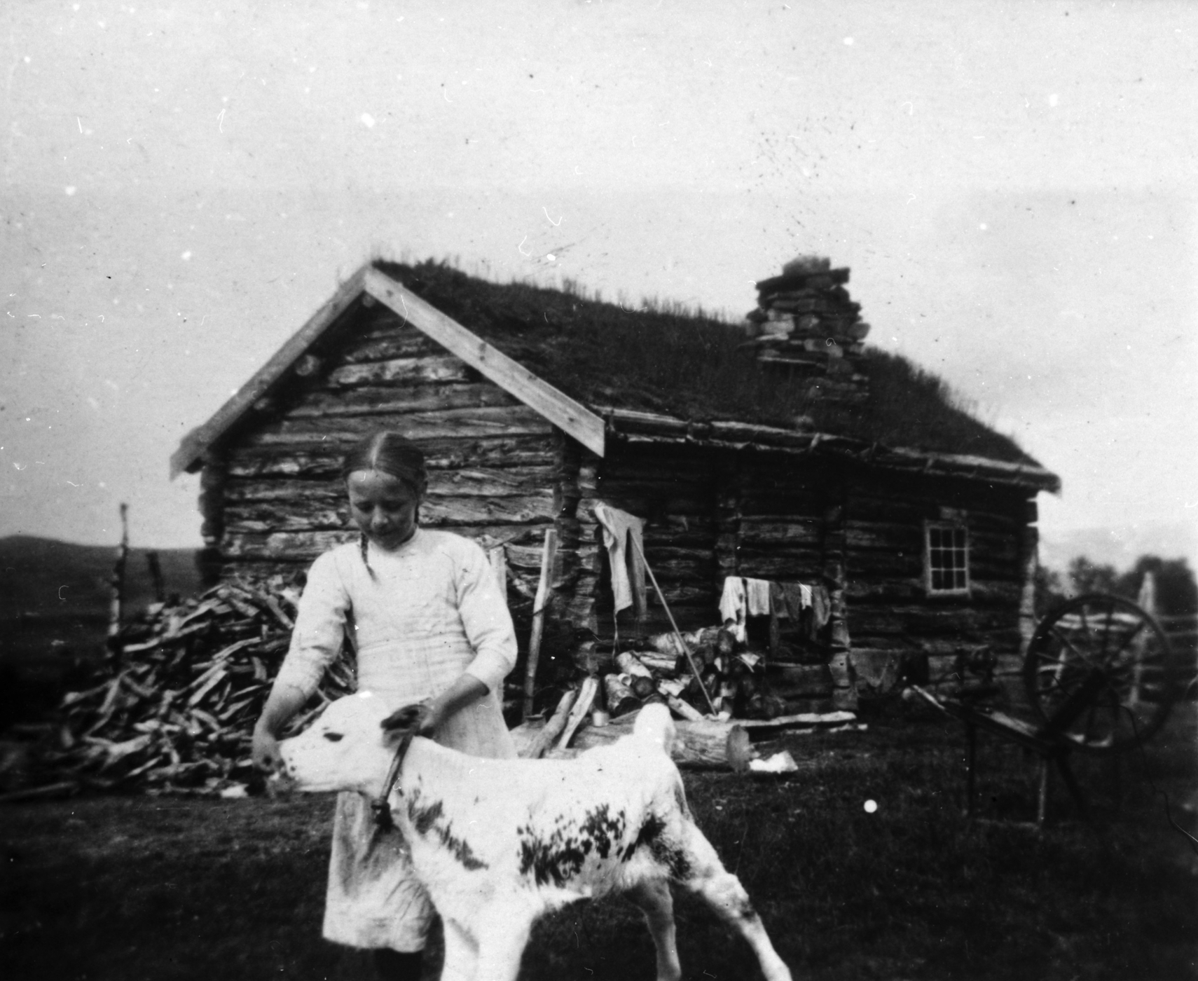 REF-0024 Fra Jøldalen, Setra til Bortstuggu Grendal. Olava K. Grendal står med en kalv