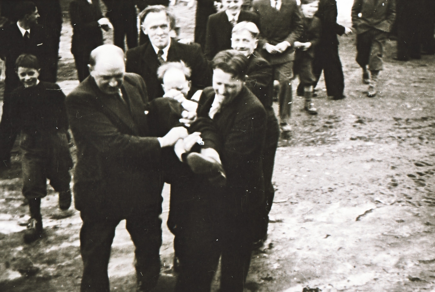 Bryllaup på Utstuggu Hårstad. Andre dagen. Leif 0. Voll blir bore inn til stabbdans (med Borghild Hoff - som var på kjøkkenet). Dei som ber er f.v. Halvdan (?) Faanes (Inset), Terje Haugen, Jon R. Herrem og ?.