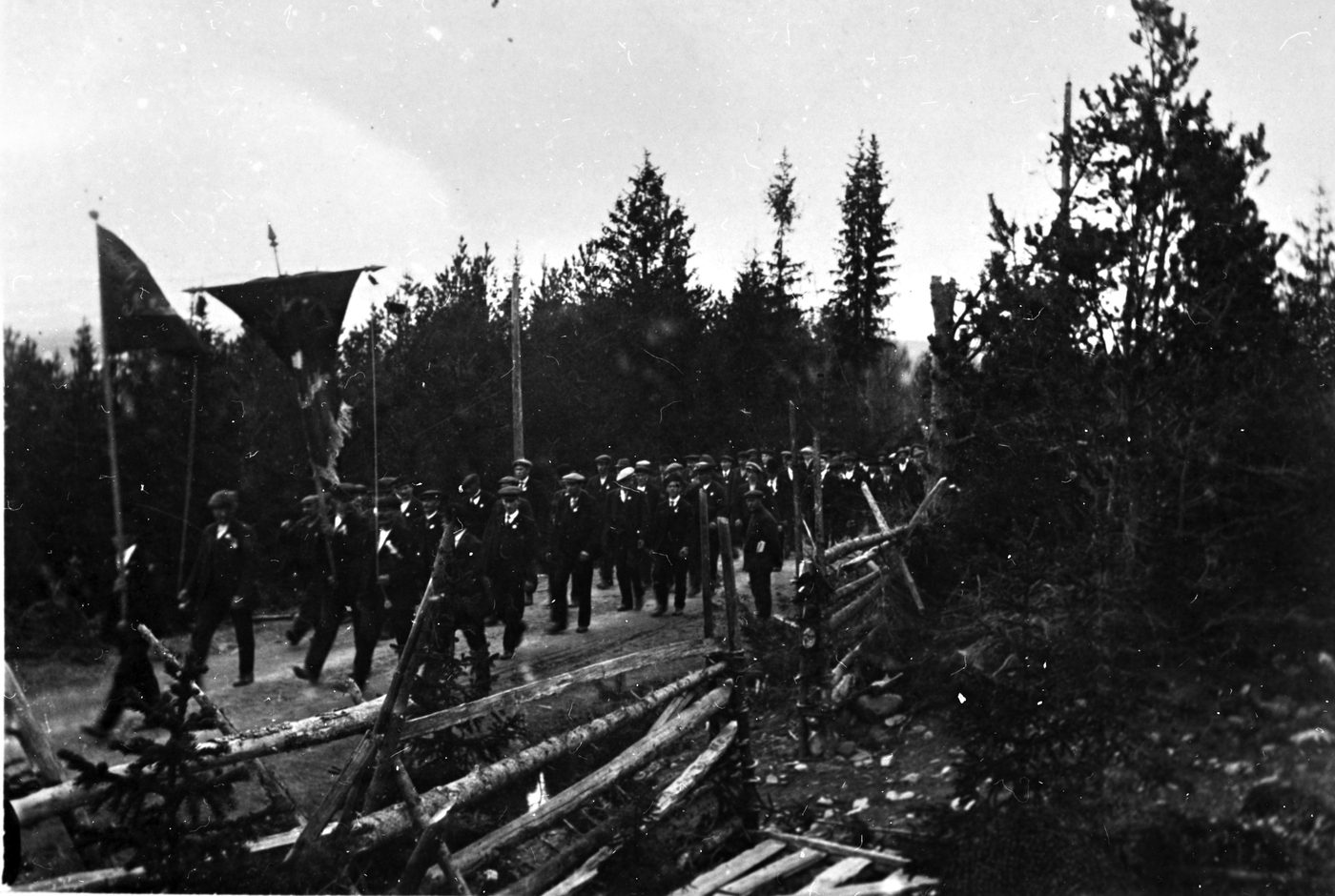 Menn, kvinner og barn går i tog med faner.