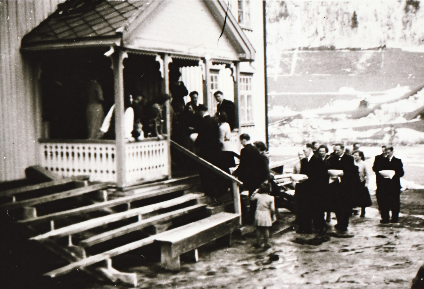 Bryllaup på Utstuggu Hårstad. Andre dagen. 'Spållå inn grøten', med felespellmann som giekk først. Grauten - rømmegraut - vart henta frå