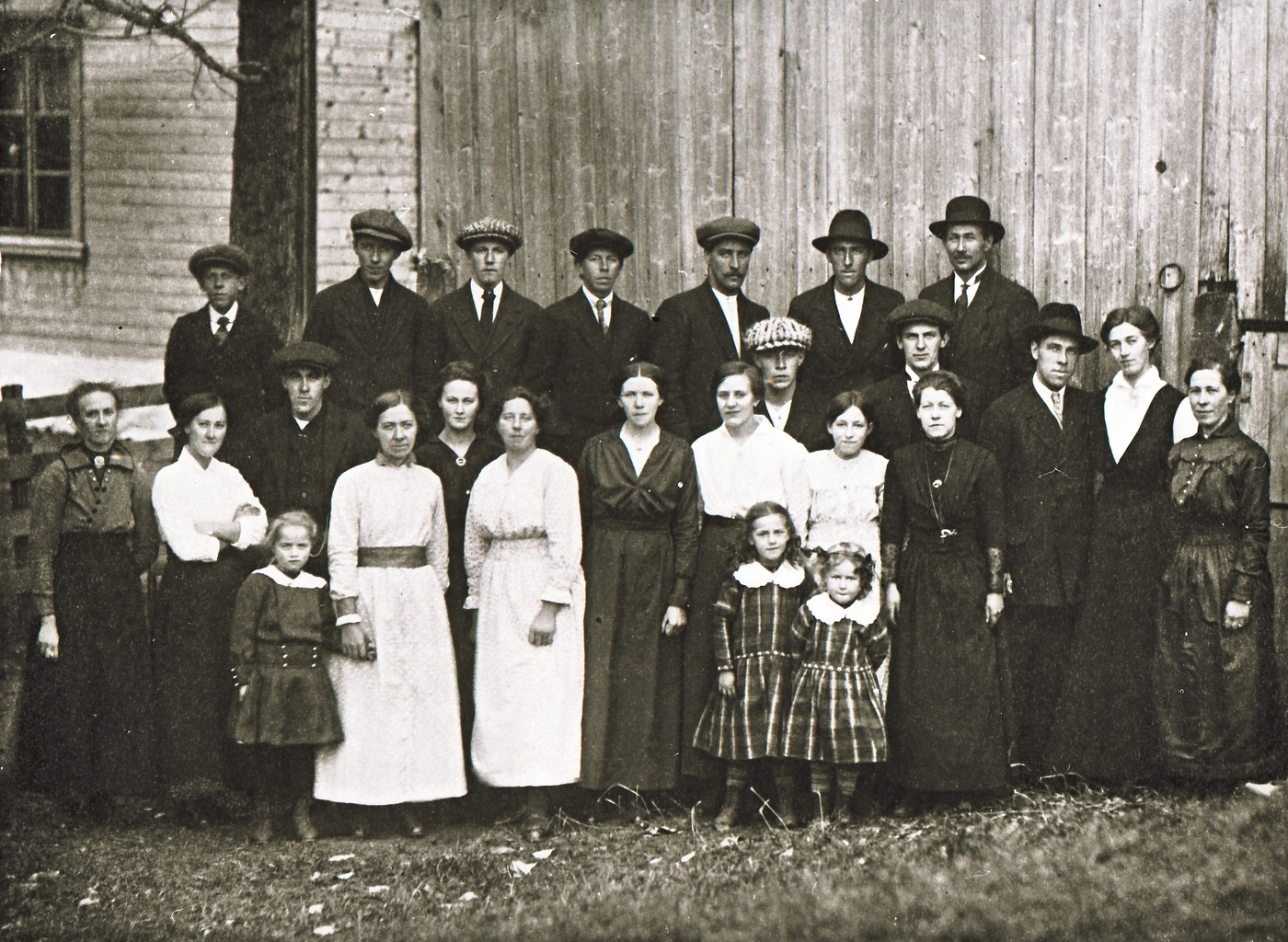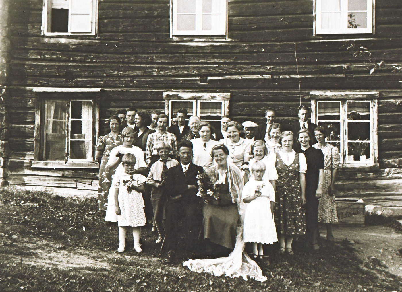Bryllaupet til Jens P. Flå og Ingeborg Sugustad. Heile gjesteflokken samla framom stoggulåna til fotografering.