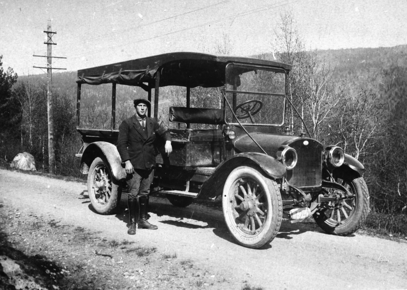 REF-0038 Personbil ved Mærk bru ca 1920. Rutebilen trafikkerte Orkanger-Berkåk. Sjåfør Nils Pettersen