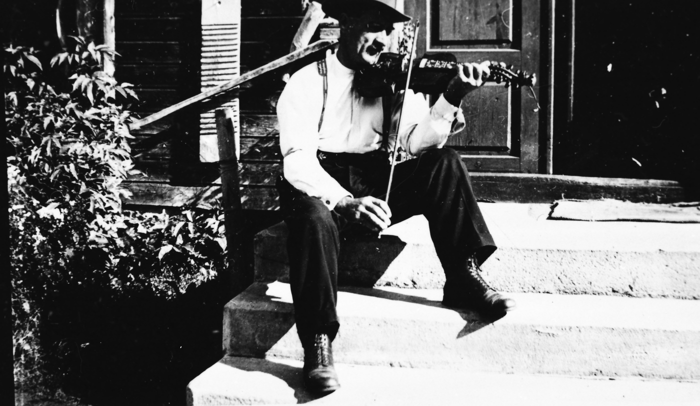 REF-0293 Ca 1940 Voll-Herrem Rennebu - 0laf Krovold spiller hardlngfele på trappa på KrovoId .