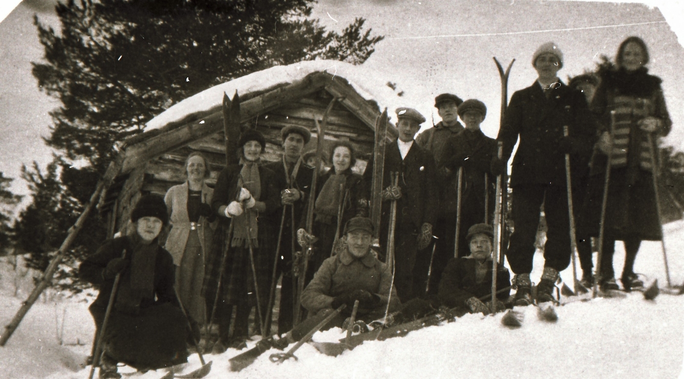 REF-0413 Herrem/Voll ca 1920. Søndagstur til Herremsætra. Fv. Jodda Herrem, Birgitte Voll, Bergljot Viggen, Halvor Rise, ?, Trygve Viggen, Olaf Moom, Leif Voll, ?, Mette Herrem. Framom Jon Hårstad, Olav Viggen.