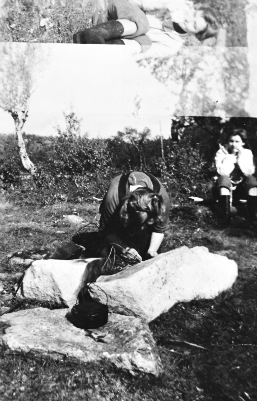 Kaffekok. Randi Johanne Hårstad tenner bålet mellom to steinar, medan Johanne Vold ventar.