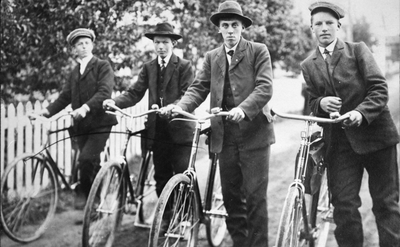 Fire unge menn på sykkeltur.