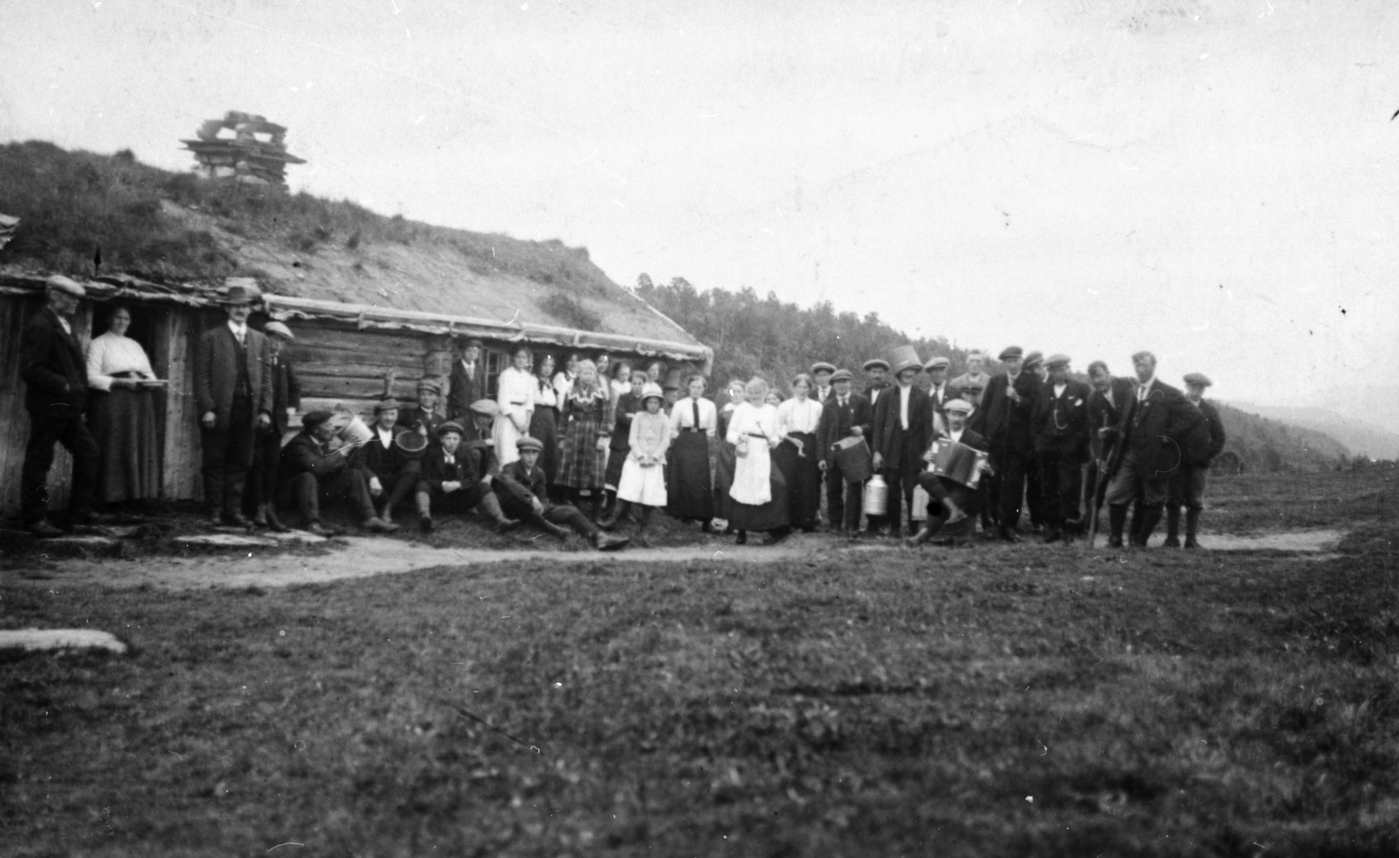 REF-0306 Krovoll Herrem Voll Rennebu ca 1934 Avslapping i graset, Kalvhåggån ved Krovoll - med sveivegrammafon.