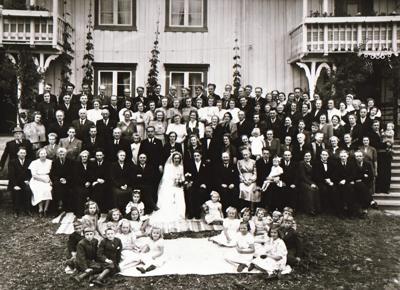 Bryllaupet til Jens P. Flå og Ingeborg Sugustad. Heile gjesteflokken samla framom stoggulåna til fotografering.