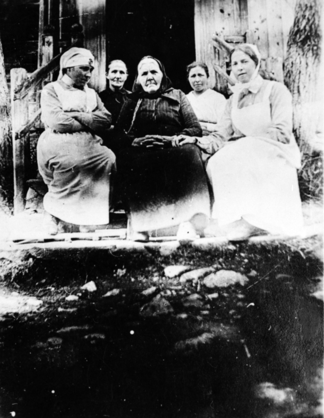 Jelan Grindal Fem kvinner sitter ute på trappao - to i sjukepleieuniform.
